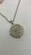 Necklace is a snake type of chain, adjustable length with a lobster claw closure. There is a brand tag on the length area but I can’t make it out. The pendant is a circle with a filigree like detail and sparkly gems.