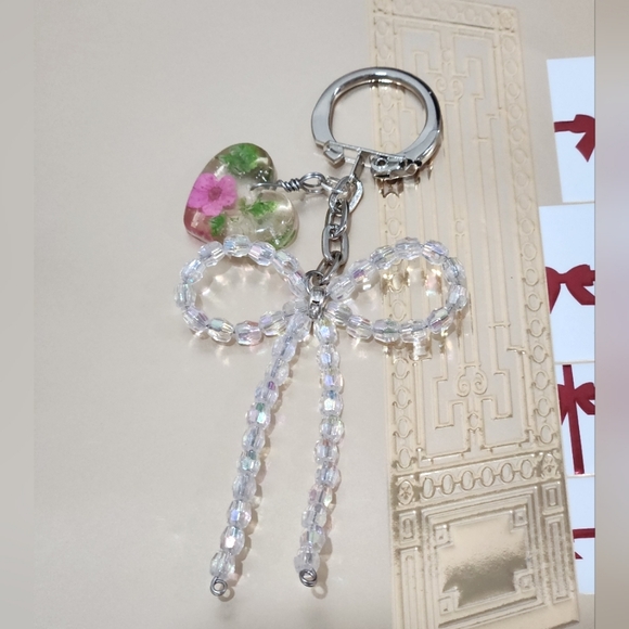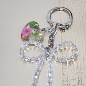 A newly handcrafted beautiful shiny ribbon keychain with a real flower resin charm