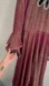 Elegant pink dress with a sparkling finish. Features a statement necklace detail and flared sleeves.