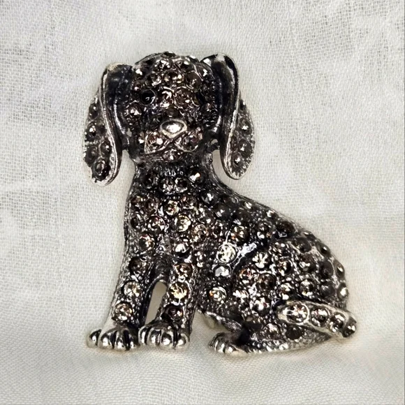 This beautiful brooch is a lovely accessory to wear. The silver-toned metal and sparkling rhinestones create an elegant look. It would be a wonderful way to show affection for your pet. The brooch is a great gift for those who love dogs. This accessory can be added to any outfit.