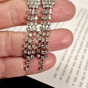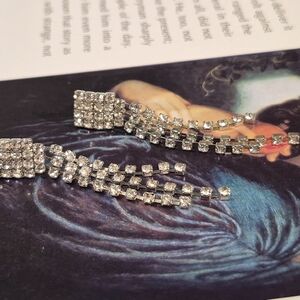 Glamorous silver drop earrings with shimmering rhinestones. Ideal for a chic look.