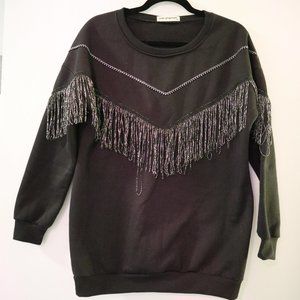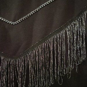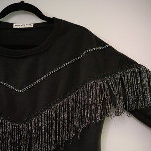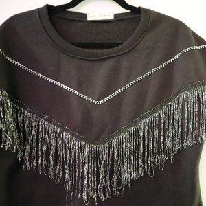 Sparkly/silver tassels in V shape along black crewneck sweater.