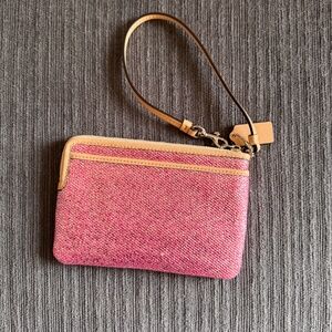 Sparkly pink Coach wristlet. Exterior back pocket. Card slots on the inside. Perfect for on the go!