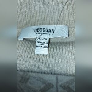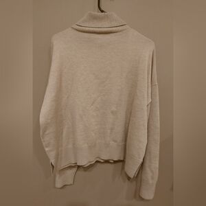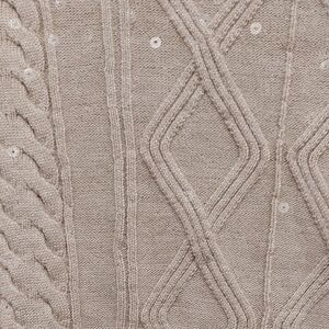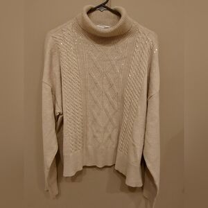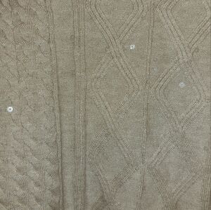 This tan sweater features a cozy turtleneck style with a beautifully intricate cable knit pattern and random sequins on the front. Its relaxed fit and chunky texture make it perfect for staying warm and stylish during cooler days.
