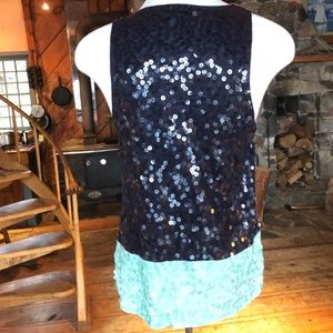 Woot-woot! If you have a cause to celebrate, or just want to pick things up a bit around the house, this J Crew tank top will do the trick! Super-fun, two-tone with light green/aqua on the base, and navy above. Party! Cotton with silk trim.