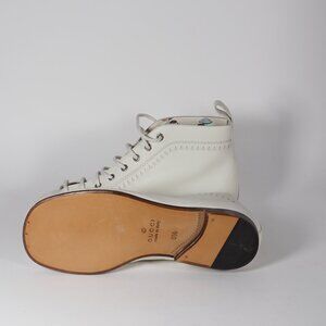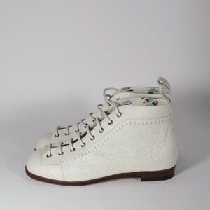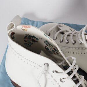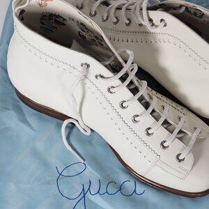 These special edition White Gucci Brogue Jakarta ankle boots are crafted from premium leather, showcasing intricate perforated brogue details. The design exudes a unique charm, blending classic brogue aesthetics with a modern ankle boot silhouette. These boots feature lace-up closure with white eyelets and laces, a subtle rounded toe, and a leather sole for durability. The interior reveals a whimsical print, adding a playful touch to the otherwise minimalist design. The leather sole also bears Gucci's signature branding, and they come in size 6 ½, offering a sophisticated yet casual look. Ideal for someone looking for a statement piece that merges traditional craftsmanship with a contemporary twist.