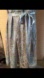Off the shoulder with a drape sleeve. Fit and flare cut with a tulle overlay with gold and silver metallic embroidery. Tie ribbon at the waist. A light blue under layer.