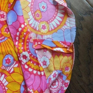 What an incredible pattern! It is a straight shift style, with matching belt/headband This has been overwhelmingly loved. It is made out of early, fragile polyester. The back zipper is in good shape as is the right seam. The front has ripped from the neck partway down and the left seam has also ripped. The hem has come unstitched. Both pits also have some damage.