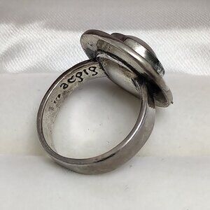 Spectacular Vintage Mabe Pearl and 925 Sterling Silver Women's Statement Ring Designer Lunar Ring Handmade Ring. The ring face shows a luminous and beautiful Mabe Pearl inset into a sterling bezel and surrounded by a circle of raised stylized rays on dark background. Like a full moon, this ring is hand made, signed on the back with the artist's signature in script "acgig" and Hallmark 925. There is great patina on the silver, I estimate ring is from 1990s. Ring size approx 6.5. This ring reminds me of "The Moon" Major Arcana Tarot Card - gorgeous statement piece.