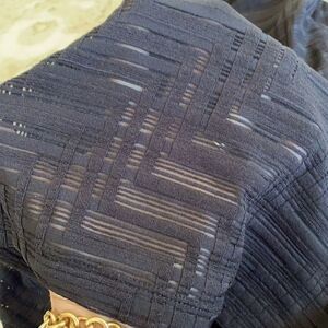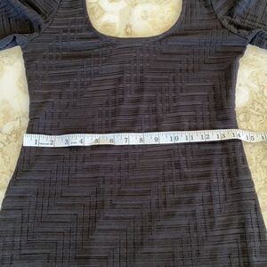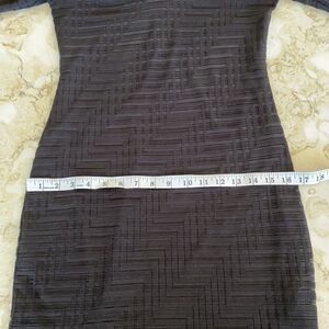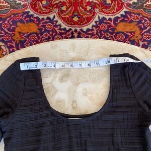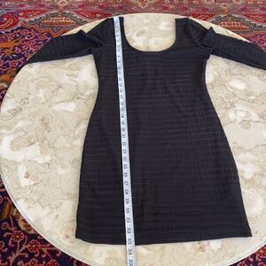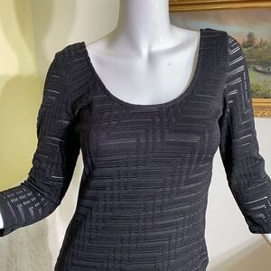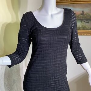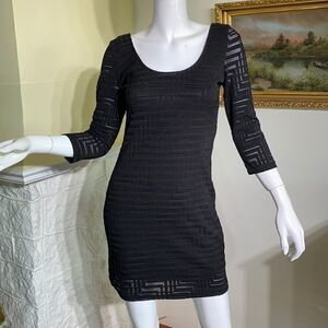 In excellent preowned condition minimalist little black mini dress features long sleeves, low back and a classy and timeless fabric pattern. The dress is fully lined and sits above the knee.