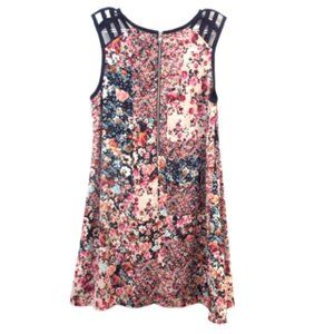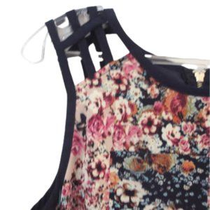 Speechless Navy Pink Chiffon Floral Patchwork Lattice Shoulder Midi Dress