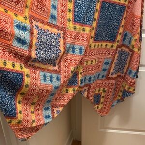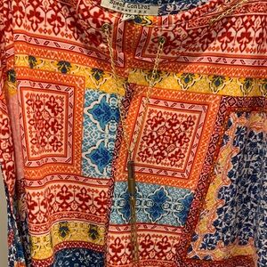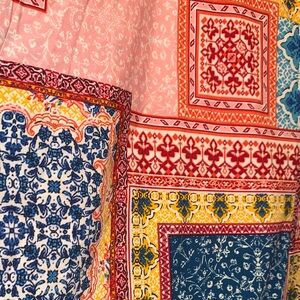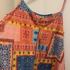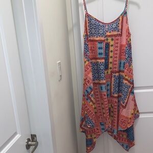 Vibrant high low dress with a multicolours patchwork design. Features thin adjustable straps and a flowing silhouette. There is a built in necklace to this dress. The sides of the dress are longer then the middle part in the front and back. Perfect for casual outings.