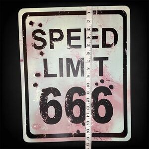 Speed limit 666 2 dimensional hanging wall decor sign. Measures approximately 17.5" tall by 14" wide
