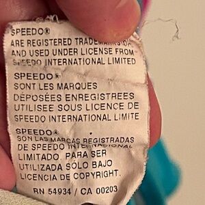 Colorful Speedo swimsuit. Teal body with lime and purple accents. Perfect for active swimming.