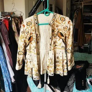 Gorgeous peplum cut vintage Spell embroidered jacket. A lovely thick cotton in tons of cream, gold, etc.