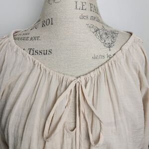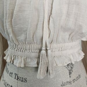 Keyhole Tassle Tie front, Stretch elastic Ruffle cuff and waist, Lightweight semi-sheer Cotton Viscose blend, Four Leaf Clover pattern Crochet Lace, Excellent Like New Condition, Size S (fits M-L as well, if you're comfortable in a crop this will fit), Pit-19, Waist-13-17, Length-16.
