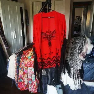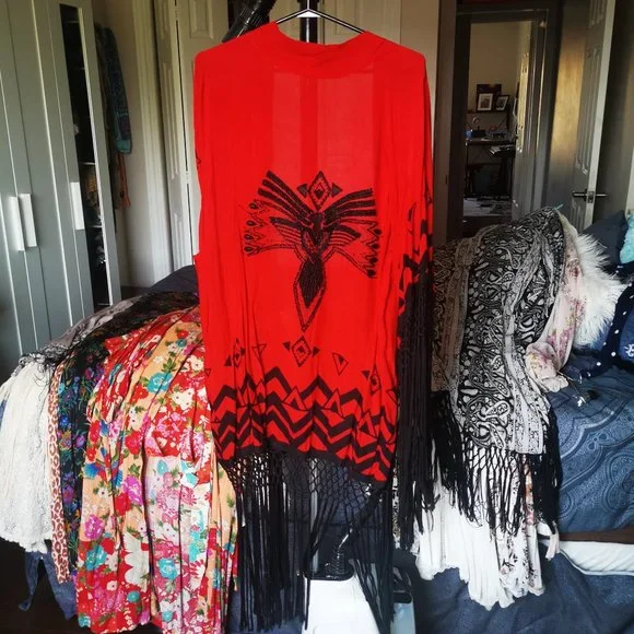 Excellent condition, no flaws, vintage Spell Kimono with stunning beadwork on the back and fringe on hem and sleeves.