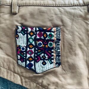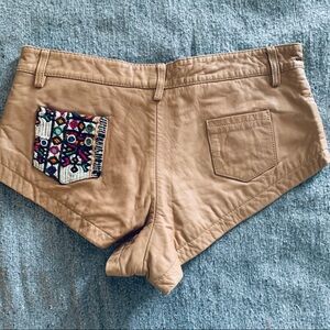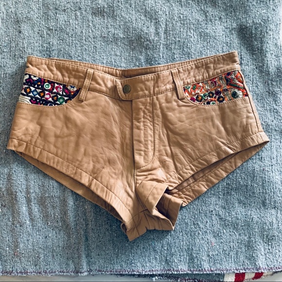 These unique shorts feature a light tan leather construction with vibrant, artisan-inspired embroidery on the front and back pockets.