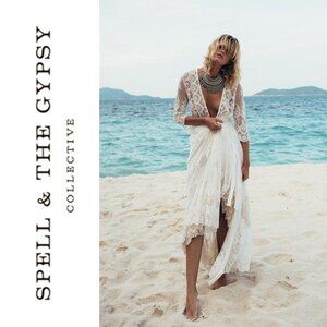 Worn once, like new condition. A wildly romantic gown inspired by the vintage silhouette of an elegant 1940s peignoir. This duster, feminine and ethereal in it's simplicity, is made from a vintage inspired mesh-lace that is original to Spell ~ you won't find this lace anywhere else because Spell designed and milled it themselves. Romance, beauty and bohemian ethereal all in one ~ a classic Spell bride.