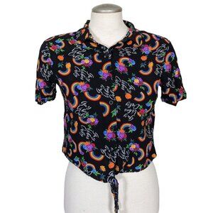 Spencers Crop Top Womens Size Medium Black Floral Pride Rainbow Print Tie Front