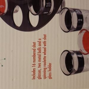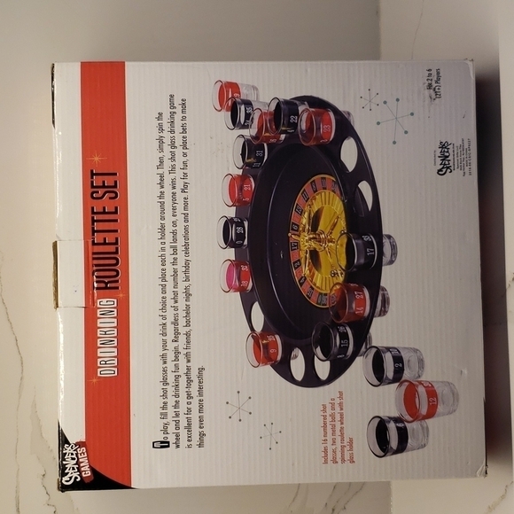 Comes in original box and box which has some usage--dents throughout and a hole in front. Contents in good condition and includes 16 numbered shot glasses, 1 metal ball, spinning roulette wheel with shot glass holder. Perfect for any holiday. Birthday, Christmas, X-Mas, etc. Being sold "AS IS" See photos.