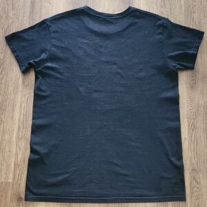 black t-shirt featuring a skeleton design with white and red accents