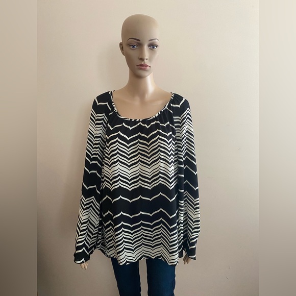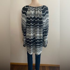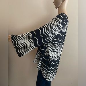 Black & White Hi-Low Top with Chevron Pattern. Bell Sleeve. Single Button Closure at Back of Neck.