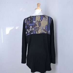 Spense | Floral blouse yellow, blue & black / long sleeve women's top. the patterned part is a blouse material and the black fabric is a sweater material.
