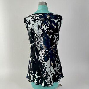 This lovely tank top, in a black and white floral pattern with subtle pops of denim blue and tan, is beautiful on the body. The silky fabric is slightly shaped and then flowy over the hips. The scooped neckline is softly pleated, adding interest and dimension. Casual enough to wear with jeans and wedges, or dress it up with a skirt and some heels. Gorgeous!