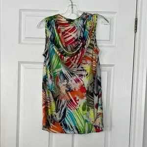 Vibrant tank top with abstract print. Features a sleeveless design. Adds a pop of color to any outfit. Pit to pit is 23” inches