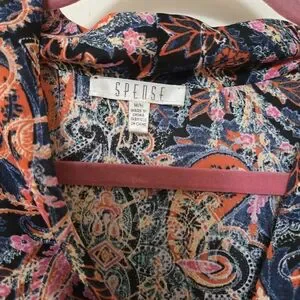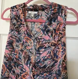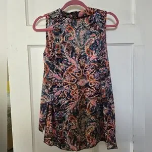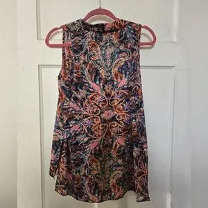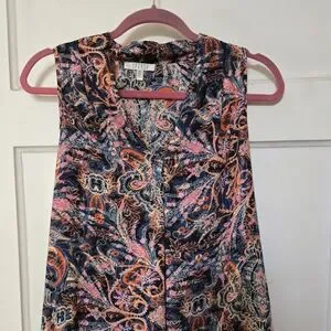Gently used paisley sleeveless blouse. This vibrant top features a mix of pink, orange, and blue colours. It is very lightweight and perfect for summer.