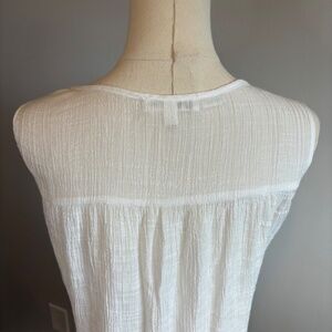 This lovely Spense (Nordstroms), sleeveless, lacy overlay, white blouse is perfect for summer. A crepe fabric with lace overlay panels and a small slit in the back, make this blouse full of design. Perfect for a summer day, or evening, and under a blazer for the office. There are no stains, tears, or holes in this top. The lace panels are made with 60% rayon and 40% polyester, and the crepe is made with 100% polyester. Machine wash cold and hang to dry. This top is in very good preloved condition.