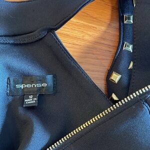 Spense black fitted Sz 12 dress with gold toned embellishments around collar