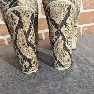Very good condition. 'Jeffrey' style leather platform heels in snake texture. Platform is 1". 4 1/4" heels. Bottom of the soles are stained but otherwise there are no marks on these. Very funky.