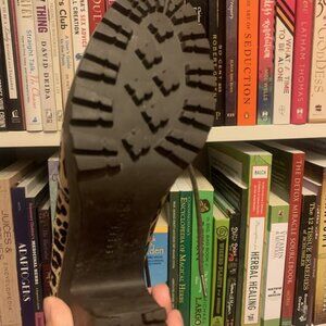 Sperry Top Sider leopard pony hair booties in size 9.5M. Tan leather, pony hair with leopard spots in brown and black. Brown lace up vamp and rounded toes. Dark brown rubber 1/2” platform and 3” tall chunky block heels. Brown rubber textured soles with no significant signs of wear. Perfect for the fall!