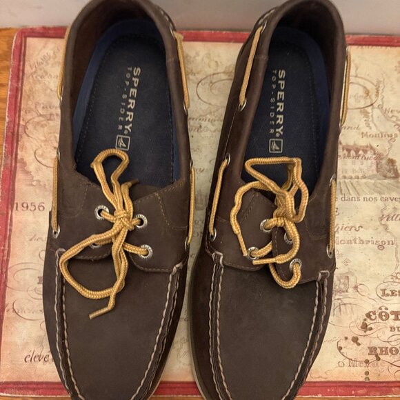 These classic, handsewn Sperry Top-Sider boat shoes are in great shape, showing only minimal signs of wear. They are a timeless style known for comfort and durability.
