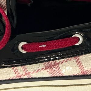 Add a bold twist to your casual footwear collection with these Sperry Top-Sider sequined plaid boat shoes! Perfect for making a statement, these shoes feature a unique red-and-white plaid pattern embellished with subtle sequins for a touch of sparkle. The patent black trim and bright red laces elevate their classic boat shoe design, ensuring a chic and playful look. Designed with Sperry’s signature comfort and durability, they’re ideal for everything from weekend outings to casual gatherings.