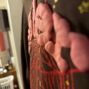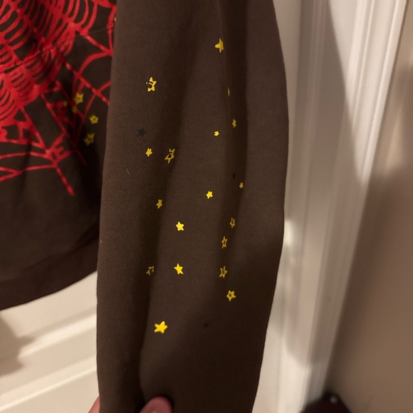 Stylish brown top featuring red web design and yellow star accents. Perfect for a unique look.