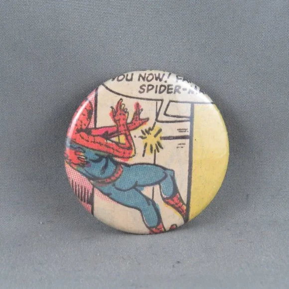 Up for sale is a Spider-Man pin. It is a celluloid pin with a comic panel of Spider-Man inside. In this panel, he is being punched out of a door. What a great pin do not miss out on it.