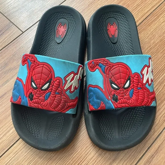 Spider-Man Slides Black with blue and red design Size 9-10 boys