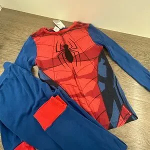 Vibrant red and blue pajamas with superhero design. Comfortable and fun for kids.