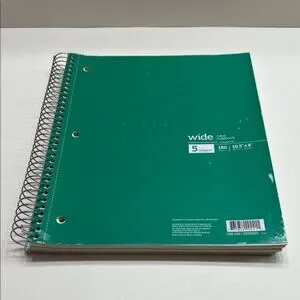 Wide-ruled, 3 hole punched, spiral bound notebook with a green cover.