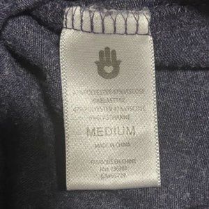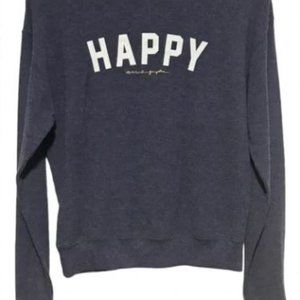 Navy blue with small embroidered rainbow heart on the front and “HAPPY” spiritual gangster written in white across the back.