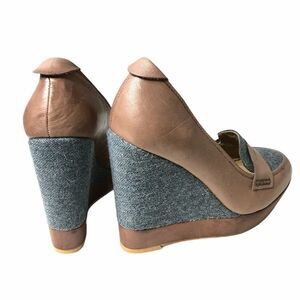 New without box. Fine upper leather - distressing on the leather, not flaws. Denim-like fabric on the wedge area.