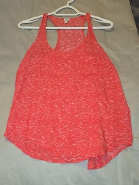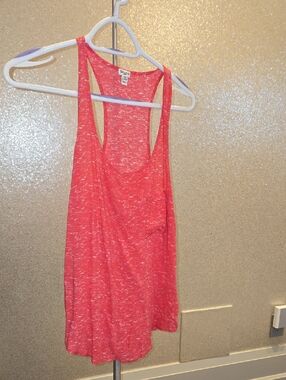 Lightweight racerback tank in a heathered coral tone. Soft drapey fabric. Casual summer staple with scoop neck.