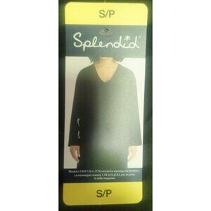 Crafted for everyday comfort, the Splendid V-Neck Black Top is a must-have for your wardrobe. This women's size small, regular-fit tee features a luxurious soft jersey material that conforms to your shape for a flattering fit. The classic black hue lends versatility to this piece, making it a perfect pairing for any bottoms.