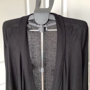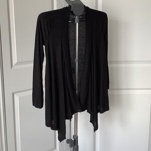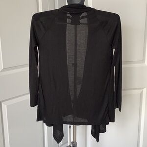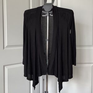 Comfortable, soft, ribbed knit black cardigan - no buttons. Made in USA. 50% each polyester and rayon. Versatile and a wardrobe staple. Generous size small.