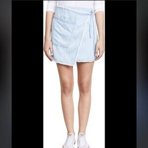 denim wrap skirt with big pocket in the front, raw hems, and a tie. From the brand splendid in a size small.