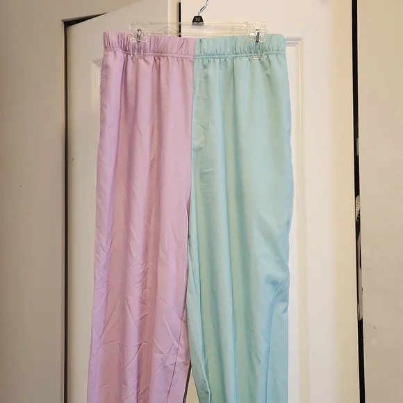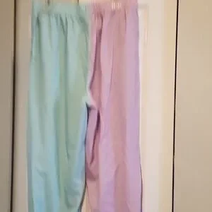 These joggers are lightweight with a stretchy waistband and pockets. Colors are teal and a light purple