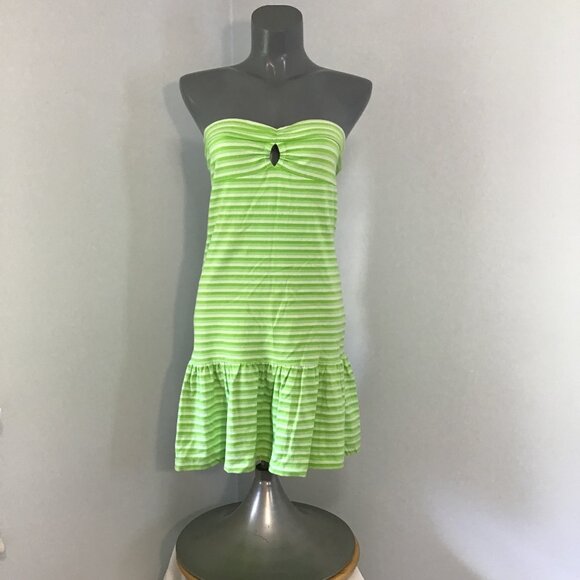 You will be ready to hit the beach in this mini dress with bright Stripes in shades of green, strapless design with a small keyhole opening on the front and ruffled hem.
